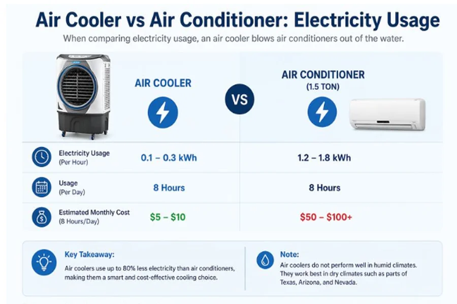 Yes. The average air cooler typically uses only 0.1–0.3 kWh per hour.
